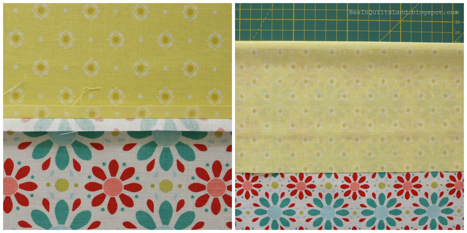 Materiał nr 5 i 6 składamy lewymi stronami do siebie. Zszywamy brzeg o dł. 50 cm, mniej więcej w odległości 1/4 cala (0,7 cm).